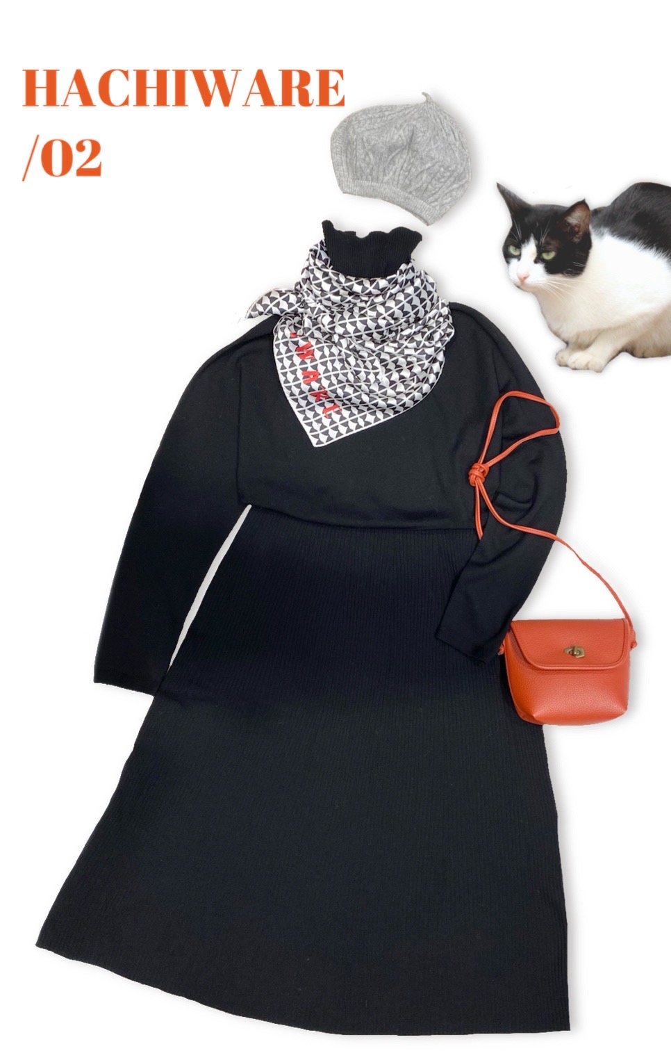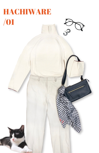 差し色には、スカーフのアクセントになっている「HACHIWARE」のロゴと同色のバッグや靴もGOOD。