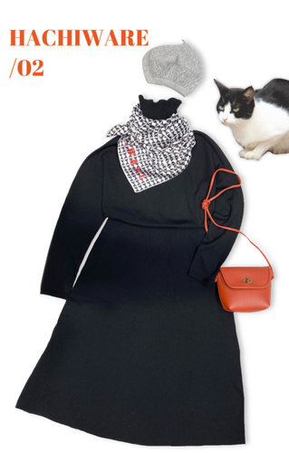 アフガン巻はカジュアルなスタイルに合わせがちですが、シックなハチワレ柄ならワンピースやスカートスタイルに合わせてもOK!