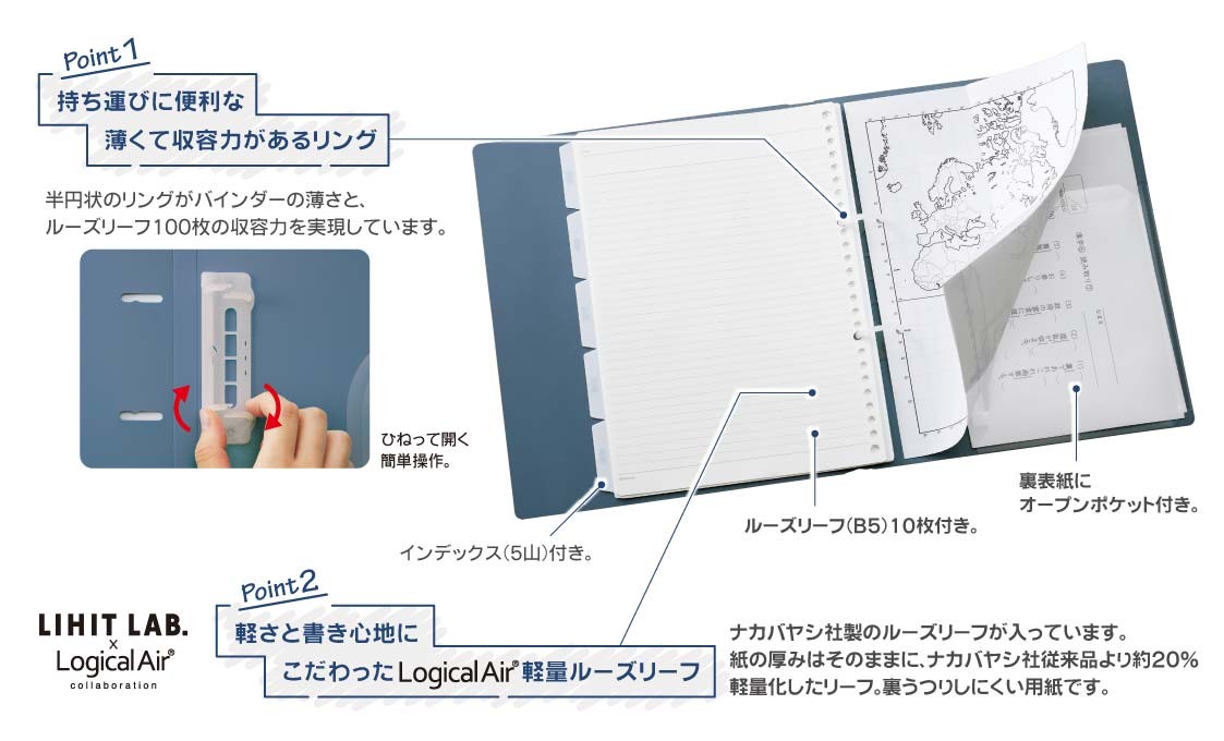 プリントルーズバインダーは、パンチで穴をあけたプリントとルーズリーフを一緒にとじることのできる2穴バインダーです。中のリーフにはナカバヤシ社製の『Logical Air®』軽量ルーズリーフを挿入した「LIHIT LAB.×Logical Air®」コラボレーション製品です。