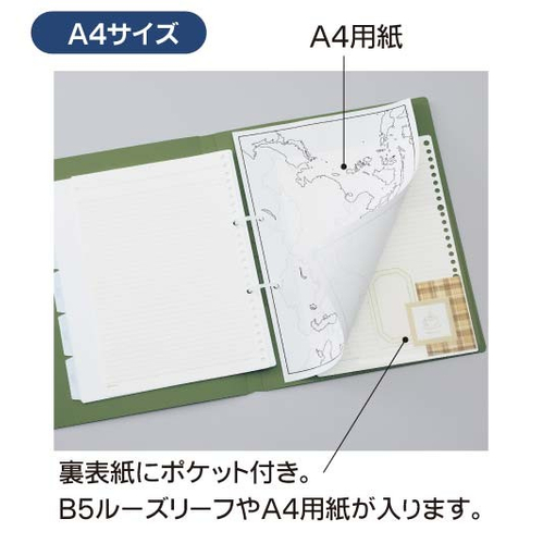 2穴とじ具を採用しているので、コピー用紙とルーズリーフを同時にとじることができ、プリントと一緒にまとめられます。