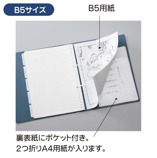 どちらのサイズもルーズリーフ(B5)10枚、5ツ山インデックス、ロータリーカード(乳白色)が付属しています。