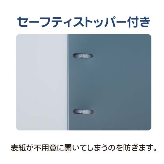 表紙が不用意に開いてしまうのを防止するセーフティストッパーを装備し、安心して持ち運べます。