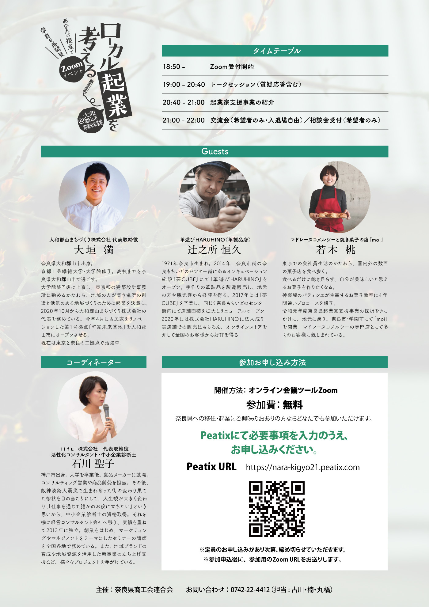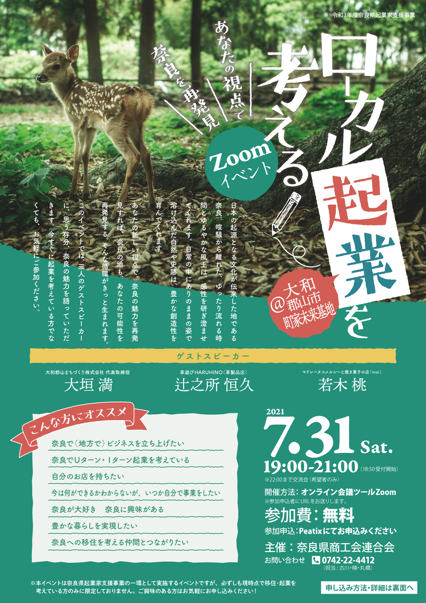 奈良県商工会連合会は、奈良県起業家支援事業の一環として、3名の先輩起業家から奈良での起業についての本音が聞けるイベント「あなたの視点で奈良を再発見!ローカル起業を考える 2021年7月31日@大和郡山市・町家未来基地」をZoomにて開催いたします。