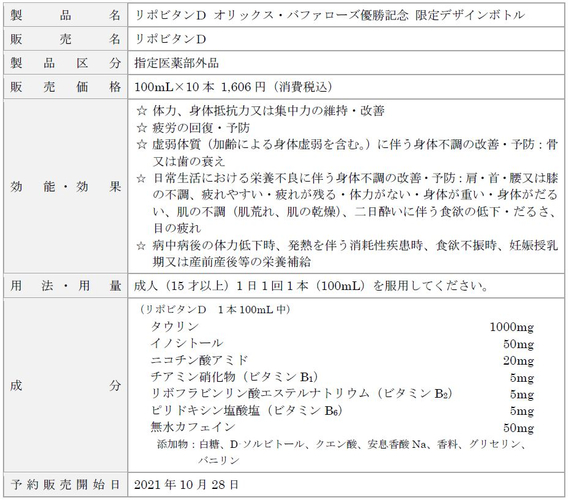 大正製薬株式会社[本社:東京都豊島区、社長:上原 茂](以下、当社)は、2021年プロ野球パシフィック・リーグでのオリックス・バファローズの優勝を祝し、「リポビタンD オリックス・バファローズ優勝記念 限定デザインボトル」を数量限定で、当社オンラインショップ「大正製薬ダイレクト」にて、本日より予約販売を開始しました。