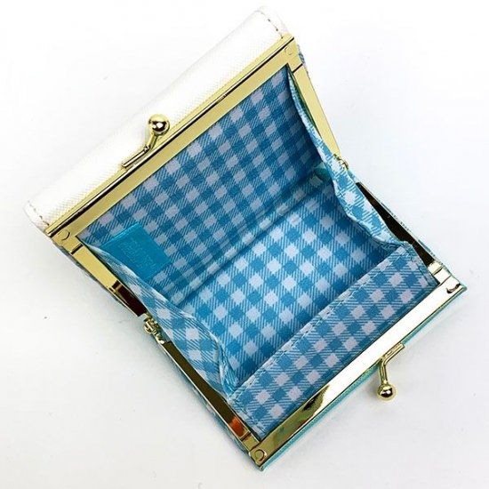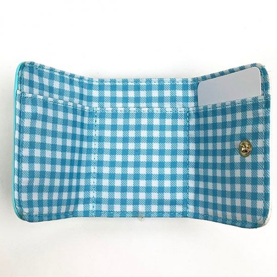 財布を開くと、こんな感じになります。水色のギンガムチェックがとってもかわいいです。清涼感あるデザインになっていますね。