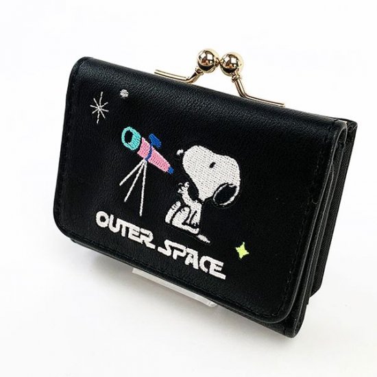 3つ目に紹介するのは、こちらのミニ財布です。黒を基調としたデザインがカッコよさを感じさせます。天体観測をしているスヌーピーが刺繡されていますね。サイズは、9.5×7.5×2.5cmです。