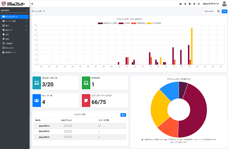 のぞき見インシデント(事故)発生を検知した際に、カメラの撮影画像およびパソコン表示画面のスクリーンショットを管理コンソールで確認することが可能です。漏洩した情報の調査ができるため、重要な証拠を記録することができます。企業のセキュリティ事故対応力を高めます。