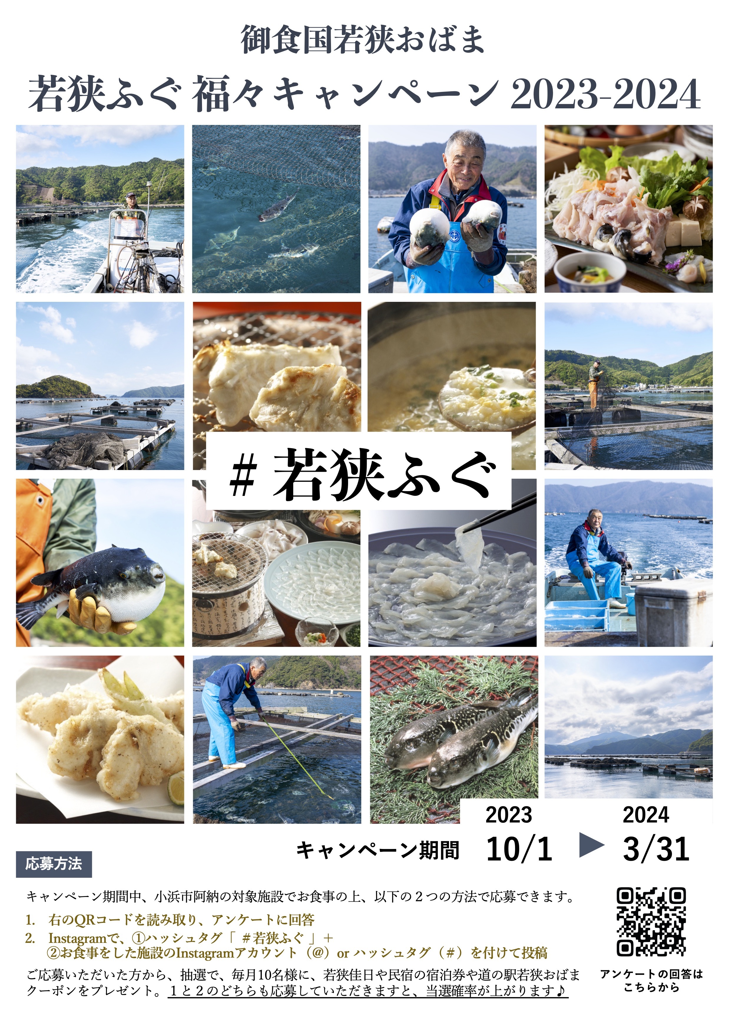 トラフグ養殖最北端の地・若狭湾で育つ「若狭ふぐ」の産地、福井県小浜市の阿納(あのう)で、本年10月1日より解禁するのを契機に2023年10月1日(日)~2024年3月31日(日)「若狭ふぐ福々キャンペーン」を開催いたします。