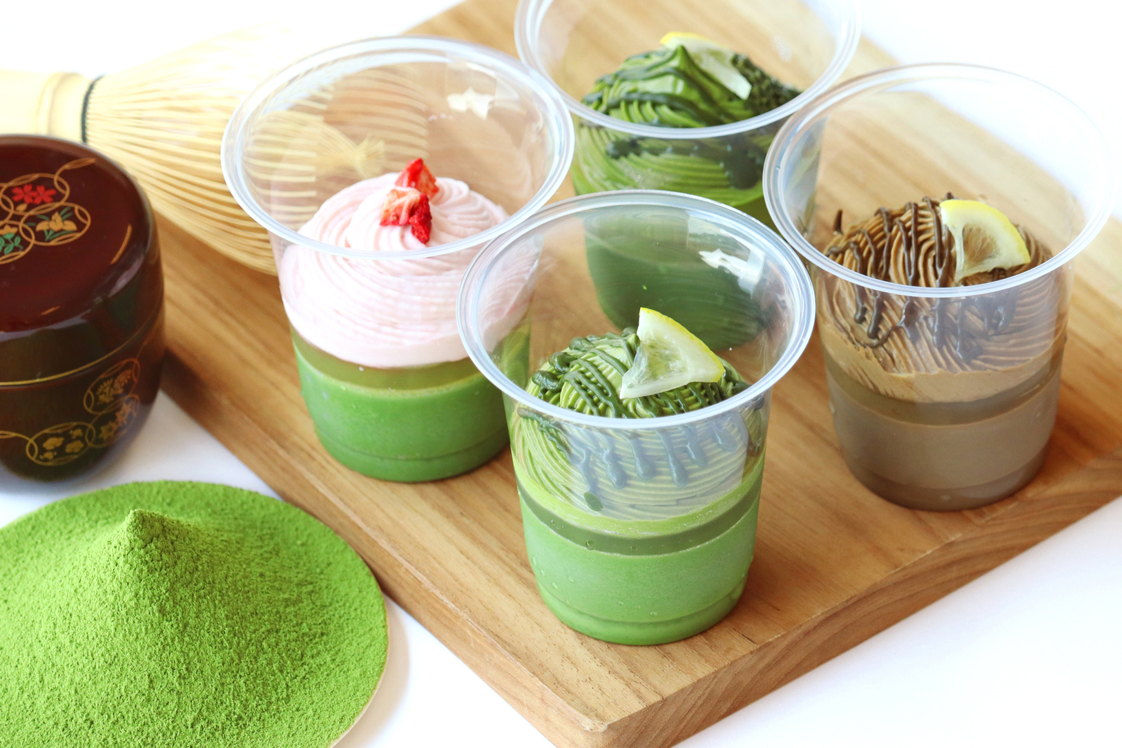1個当たり点てる抹茶2杯分の抹茶を贅沢に使用。クリームに入れたレモン果汁やレモンゼリーの層が、抹茶が持つ爽やかな香りを更に引き立て、残暑厳しい季節にぴったりの抹茶スイーツとなりました。