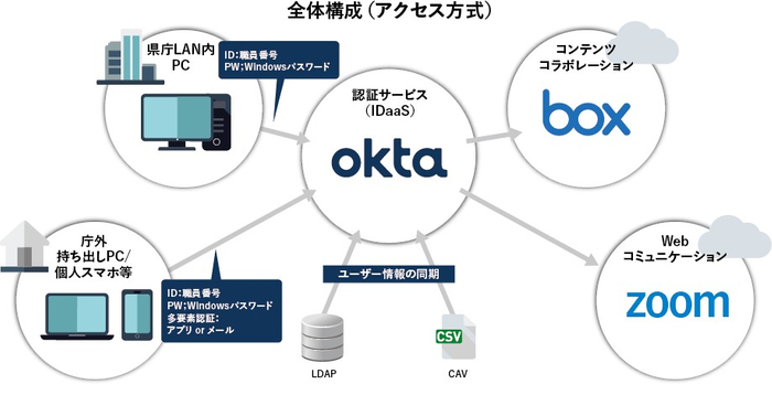 この計画の取り組みとして進めている「ペーパーレス化」「テレワーク」の実現のために、一般競争入札において、マクニカが一次代理店として取り扱う、コンテンツクラウド基盤の「Box」、クラウド型アイデンティティ管理・統合認証サービスの「Okta」と、パートナー企業の取り扱うZoom等の他製品が合わせて採用され、支援を行うことになりました。