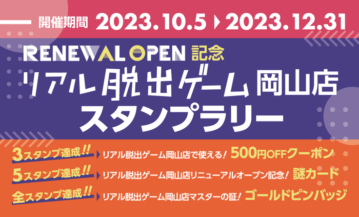 中国、四国地方のリアル脱出ゲーム旗艦店として、 岡山駅東口周辺エリアに移転してバージョンアップ! リアル脱出ゲーム岡山店 本日2023年10月5日(木)リニューアルオープン!