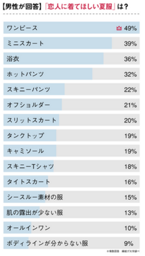 次のグラフに見る通り、ワンピースは、女性にとっても男性にとっても、トップアイテムというわけなのです。