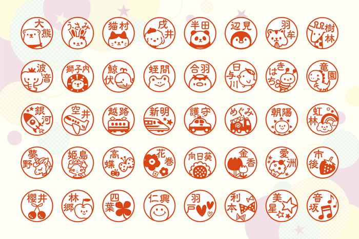 個性的なイラスト入りネーム印「印プラス」は、10シリーズ、全125デザインをラインアップ。