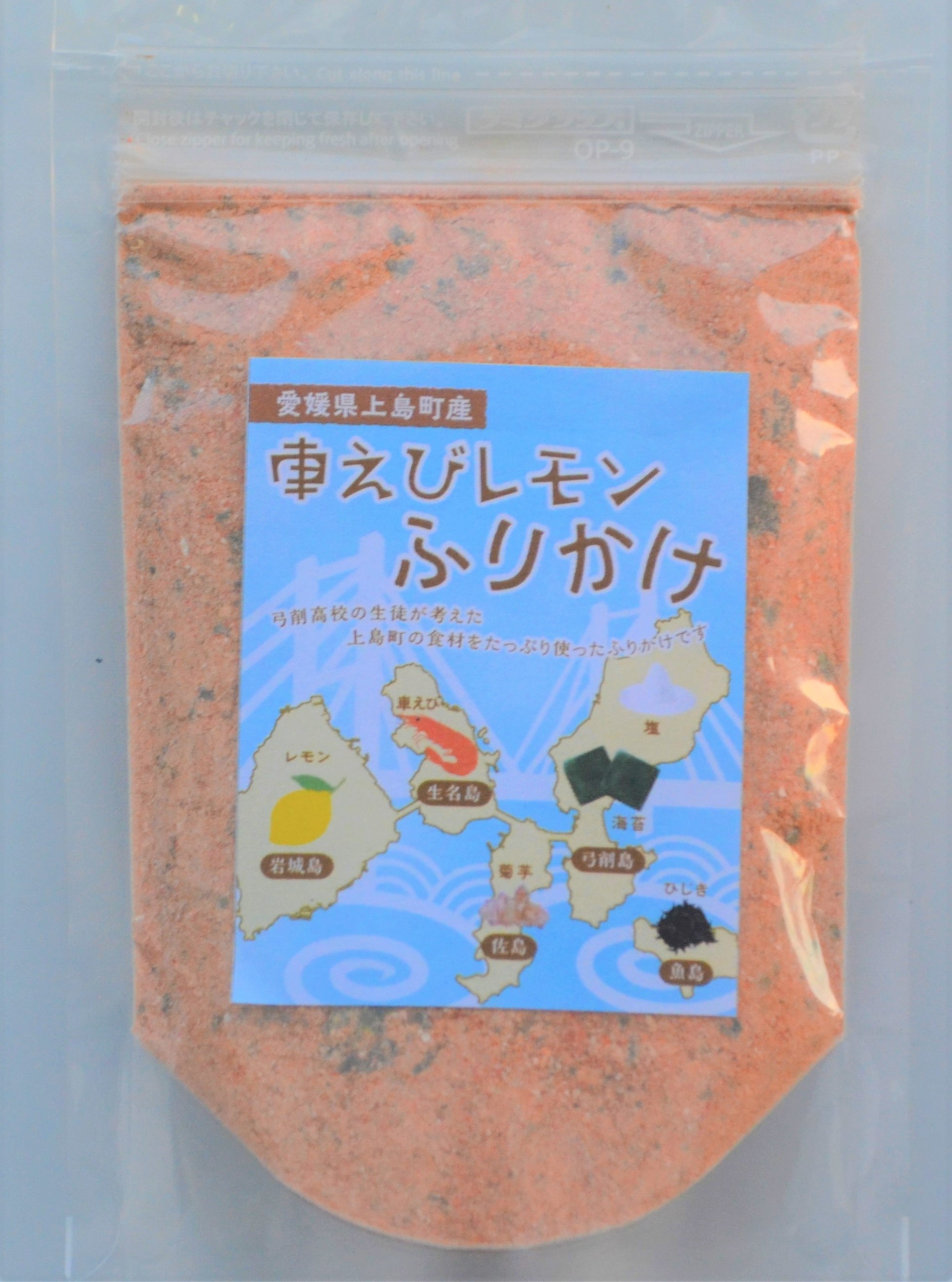 瀬戸内海のほぼ真ん中に浮かぶ25の島で構成された上島町。そのうちの5つの島(生名島、岩城島、佐島、弓削島、魚島)の特産品を使った「ふりかけ」。生名島の特産「車えび」の頭は使い道がほとんど無いことを知ったことが開発のきっかけ。