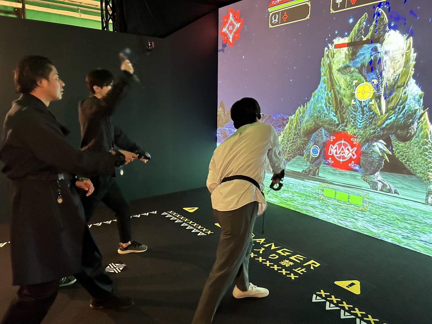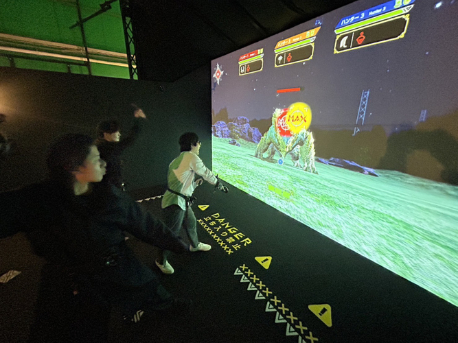 本アトラクションでは、参加者は「アワジ集会所」に訪れた新米ハンターとなって、腕利きのハンターになるための訓練クエストに挑戦することができます。訓練クエストは「フィールド探索」と「大型モンスター討伐」の二部構成。参加者は、討伐エリアの中で、アクションコントローラーとトラッキング端末を身に付けた状態で画面上の大型モンスターと対峙し、全身を使って武器を操り、攻撃を回避しながら討伐成功を目指します。