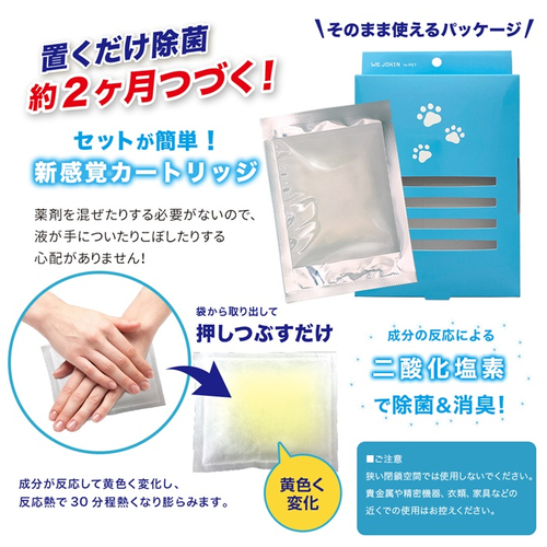「ウィ.ジョッキン ペット用」は二酸化塩素発生剤を使用した空間除菌商品になります。