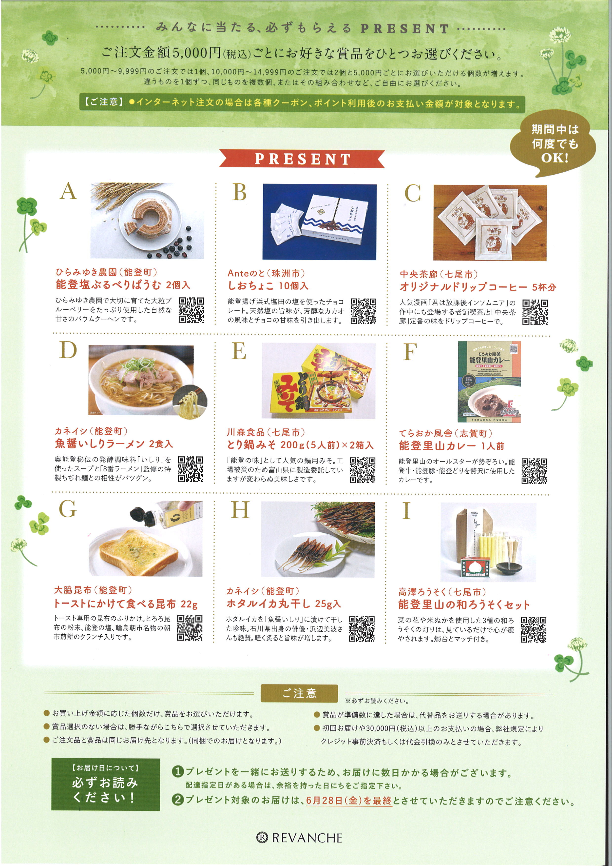 株式会社ルバンシュ(本社:石川県能美市/代表取締役:千田 和弘)では、能登半島地震で被災した事業者のプレゼントがもらえる「みんなに当たる、必ずもらえるプレゼントキャンペーン」を、2024年4月22日(月)~2024年6月21日(金)に開催いたします。