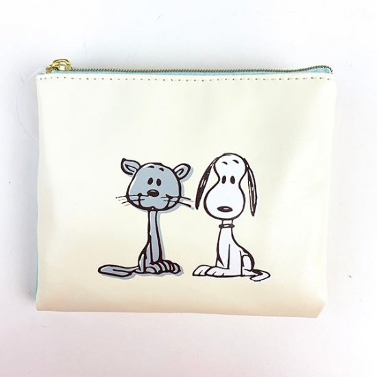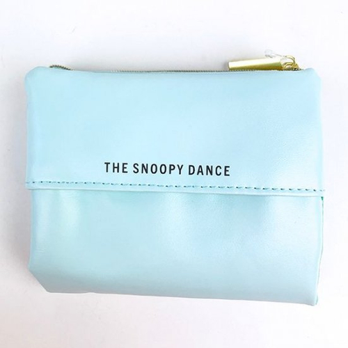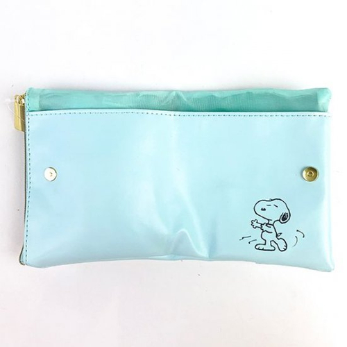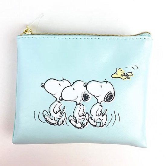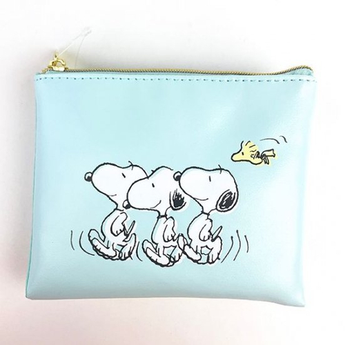 パステルブルーのポーチに、ゴキゲンな表情のスヌーピー&ウッドストックのイラストが入っています。