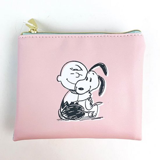 ハグデザインのポーチは、くすみピンクのかわいいカラーで登場です。嬉しそうなスヌーピーとチャーリーブラウンの笑顔にほっこり♪
