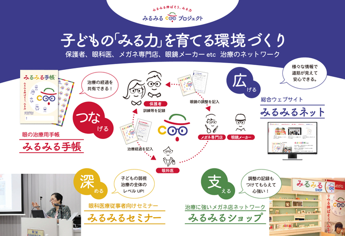 みるみるプロジェクトは、【みるみる手帳】を出発点に、弱視・斜視治療など子どもの眼を守り育てるため、保護者・眼科・メガネ店・幼稚園保育園など関係者の連携強化を支援する事業を展開しています。