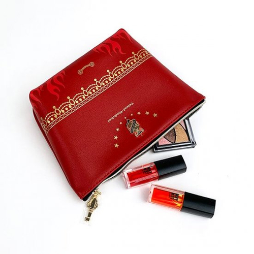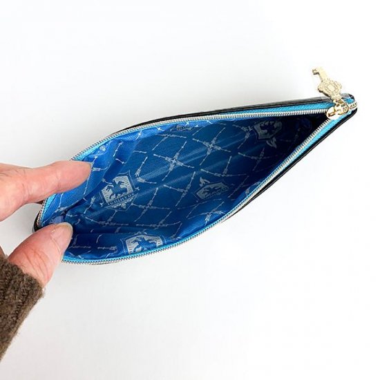 深い赤がシックな、スカラビアの舟形ポーチです。寮のエンブレムが中央にデザインされていて、高級感もある仕上がり♪ゴールドのチャームもついていて、さらにリッチな雰囲気です。