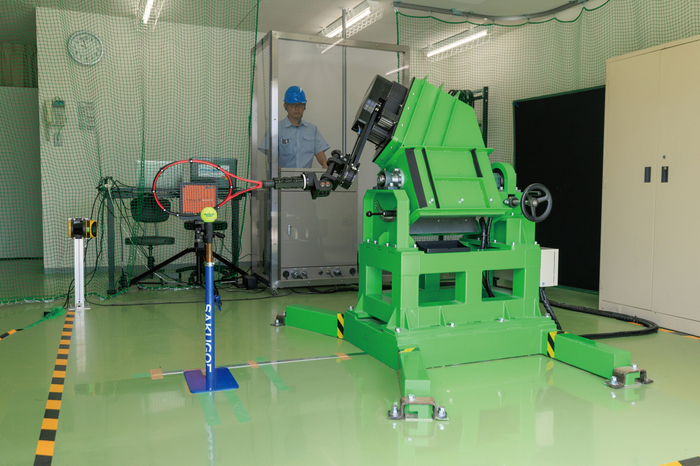 スイングマシンによるテストのほか、アマチュアからトッププロまでさまざまな方のヒューマンテストを行い、「打ちやすさ」、「コントロールのしやすさ」など総合的に測定、解析、評価を行う施設で、その結果を開発部門にフィードバックし、テニスラケットやテニスボールの商品開発に活かします。このほか、当社と用品使用契約を結んでいる選手のフィッティングなども行っていきます。