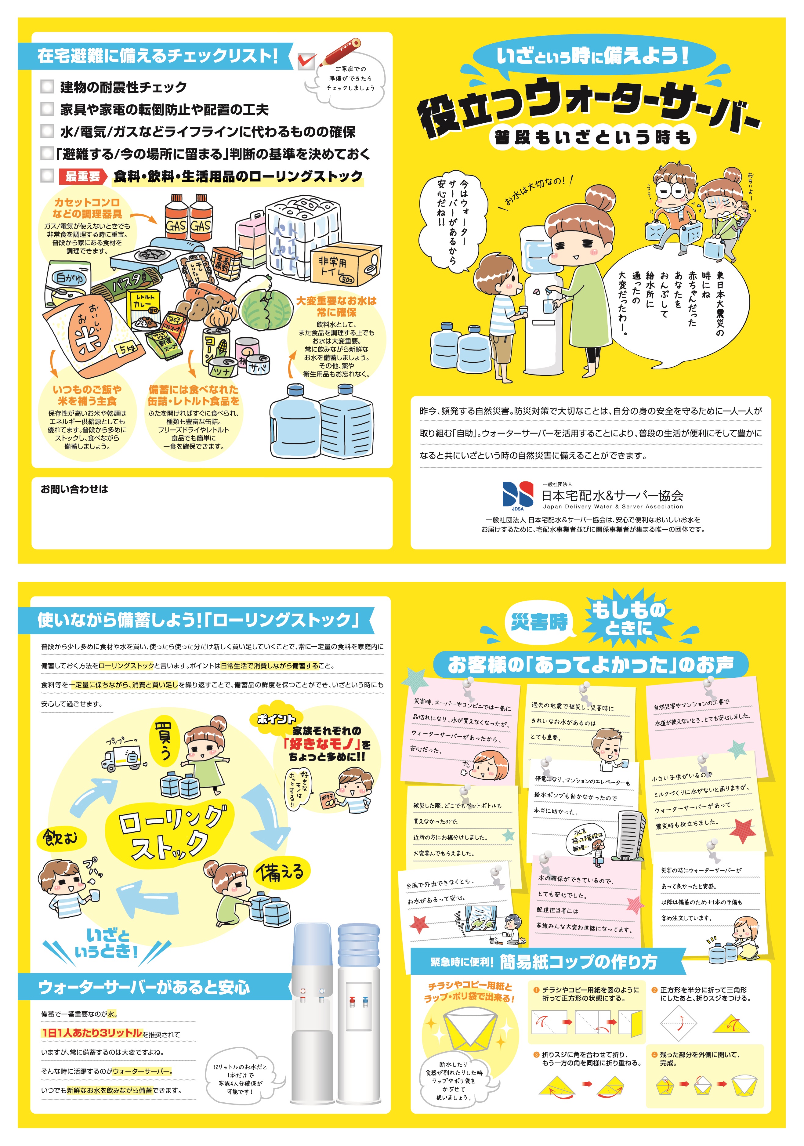 JDSAが作成した防災パンフレットでは、冷水と温水の出るウォーターサーバーを活用することで、日常生活を便利にするだけでなく、災害時にも安定した水の供給が可能であることを紹介しています。実際に、災害時にはスーパーやコンビニのミネラルウォーターが品切れになることが多く、安全な水のストックや、定期配送されるウォーターサーバーの水が安心につながったという声が寄せられています。以下に利用者の声の一例を掲載しますが、宅配水形ウォーターサーバーの利用は日常だけでなく、災害時にも大きな安心につながります。