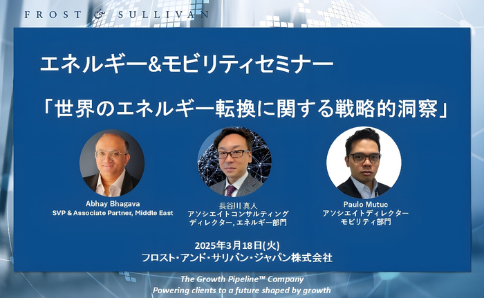 フロスト&サリバンは、3月18日(火)15:00-17:00 「世界のエネルギー転換に関する戦略的洞察(エネルギー&モビリティ)」と題する対面式セミナー開催致します。
