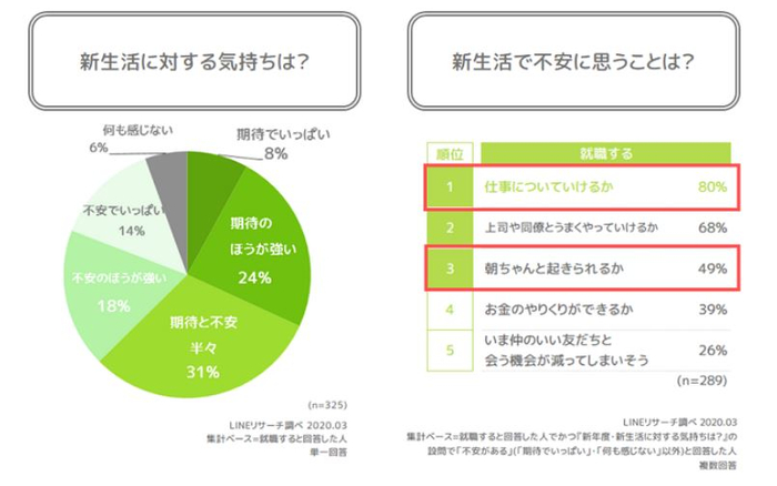 不安の中身で注目したいのは、「朝ちゃんと起きられるか」という項目。おもしろいことに新高校生では5位、新大学生では4位だったこの項目ですが、新社会人では次のとおり3位へと、かなり大きな心配事になっているのがわかります。
