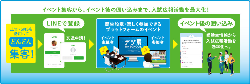 オンラインでの入試説明会・学校説明会の 学生集客から、開催、囲い込みまでを、 オンラインプラットフォーム「デジ展 for SCHOOL」で実現!