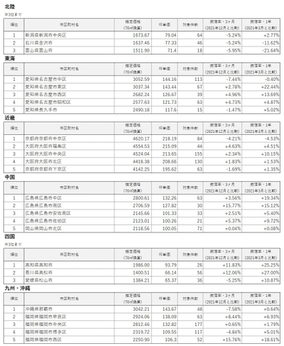 ・各エリアでの2022年3月の推定価格が1位の市区町村は以下の通り。