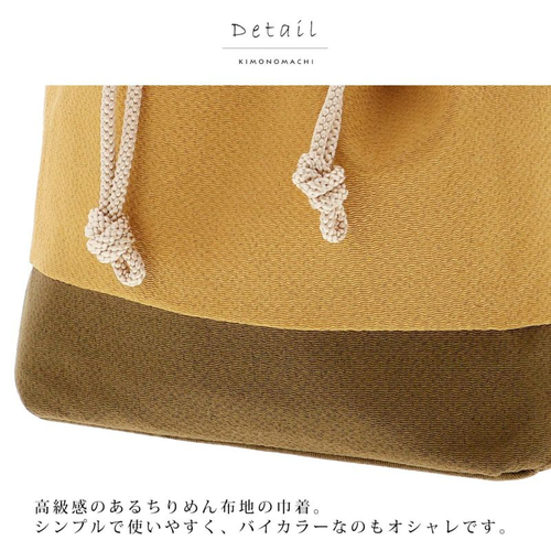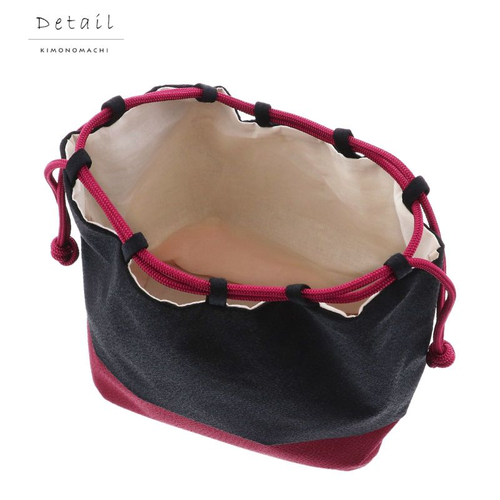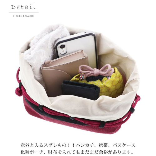 巾着も京都きもの町オリジナルで販売。バイヤーがこだわりの配色と、ちょうど良い大きさの型を厳選。熟練の職人が丁寧にひとつずつ作る、日本製の巾着バッグとなっている。卒業式、修了式の袴に合わせたり、小紋などの普段のお着物で、ちょっとお出かけという時にもおすすめ。