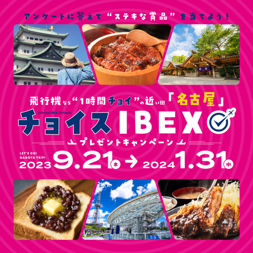 アイベックスエアラインズ株式会社(本社:東京都江東区、以下IBEX)は、2023年9月21日(木)~2024年1月31日(水)の期間において仙台=名古屋(中部)線の利用促進を目的とした「チョイスIBEXプレゼントキャンペーン」を実施いたします。