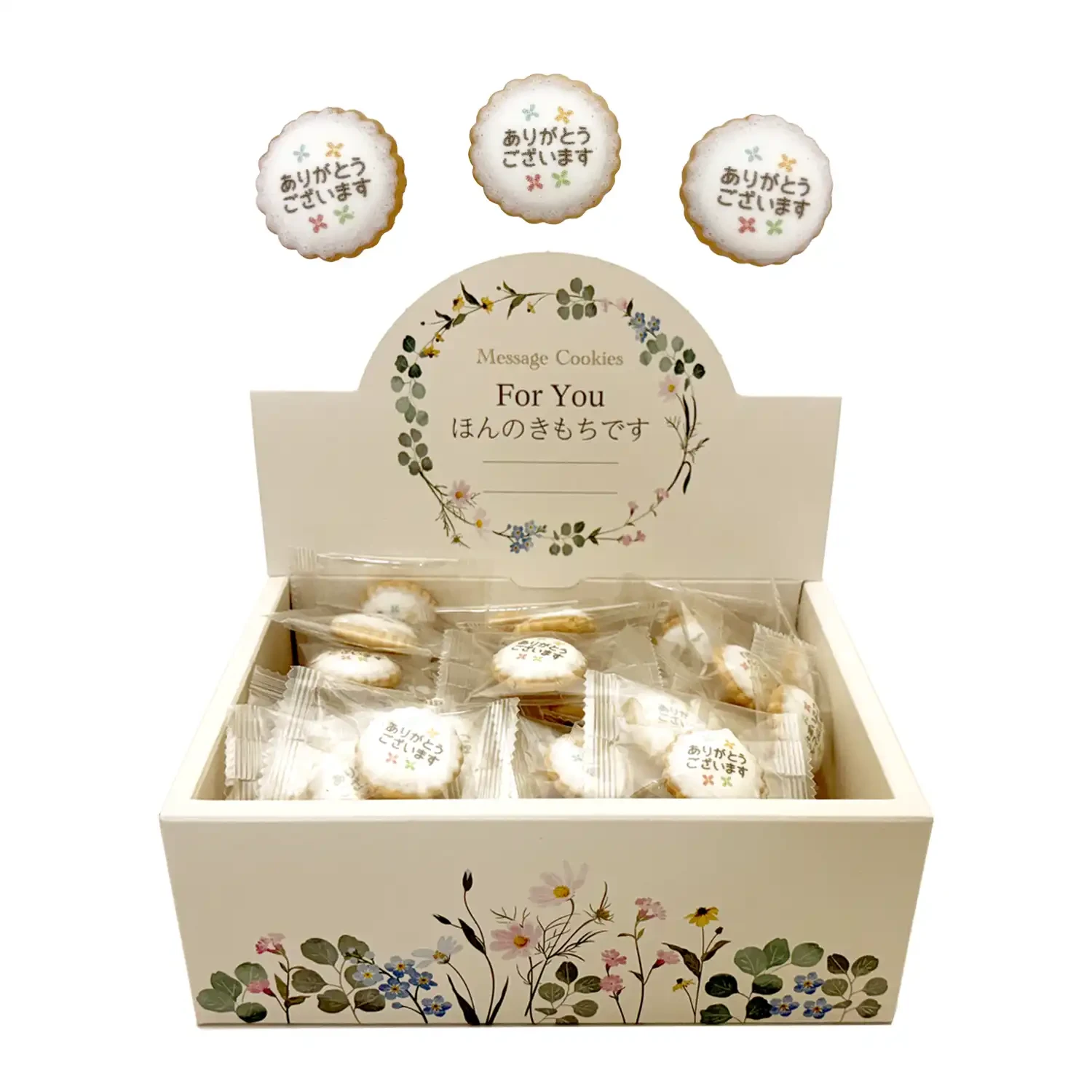 「ありがとうございます」「お世話になりました」のメッセージがフードプリントされたアイシングビスケットを個包装し、約50粒をそのまま置けるギフト箱に詰めました。箱は蓋を折り曲げるだけでスタンド型になり、オフィスやイベント会場で自由に取っていただけるスタイルでお渡しできます。退職時のご挨拶や、卒業・卒園の謝恩会、異動の際のお礼の品としても最適です。