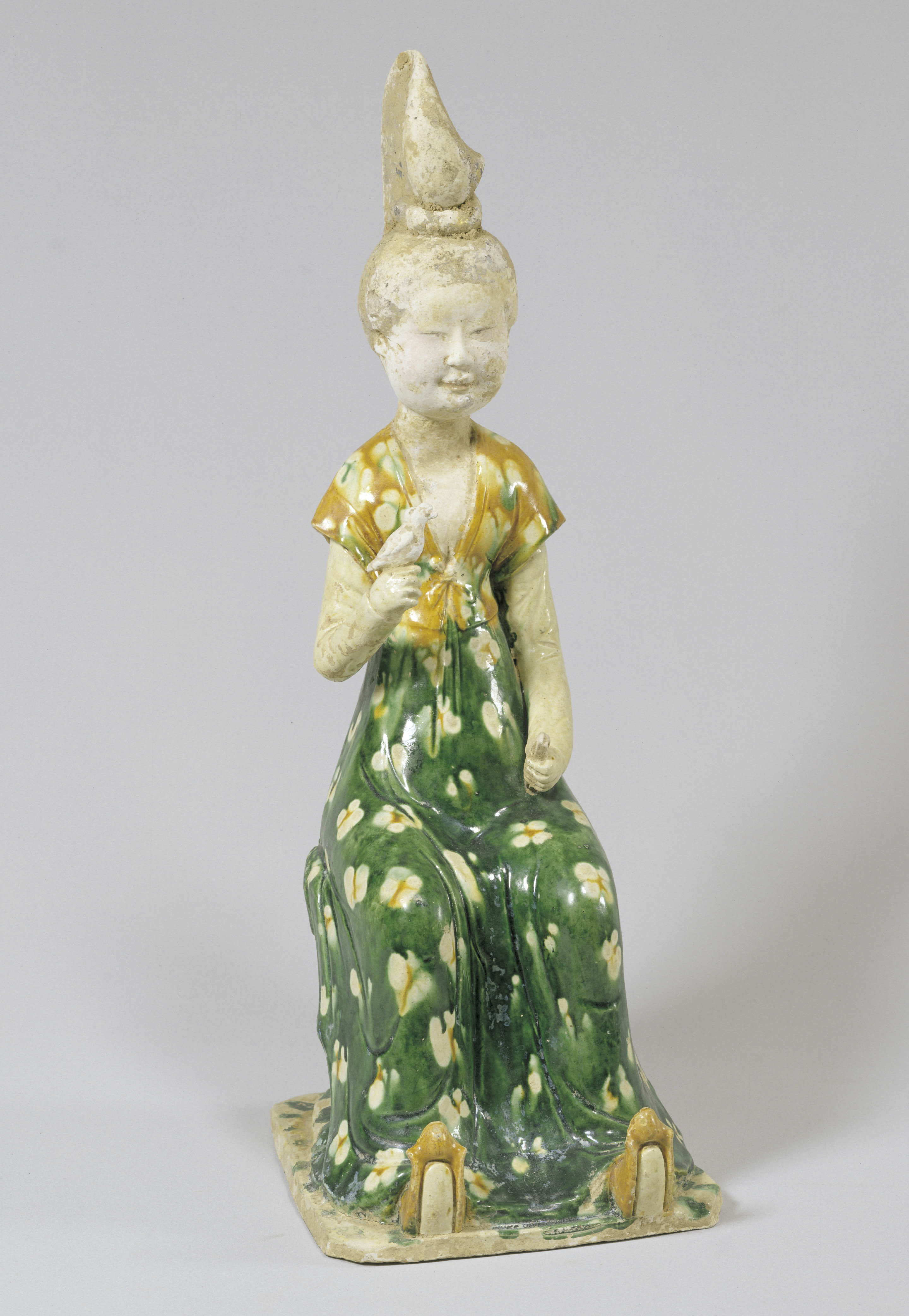 にっこり微笑む表情と白い花の模様があらわされたスカートが愛らしい若い女性の像です。結い上げた髻(もとどり)には金の髪飾りがつけられています。東西交易で繁栄した唐時代、その勢いを映すように高貴な女性たちのあいだで高く大きく結い上げた髪形が流行しました。