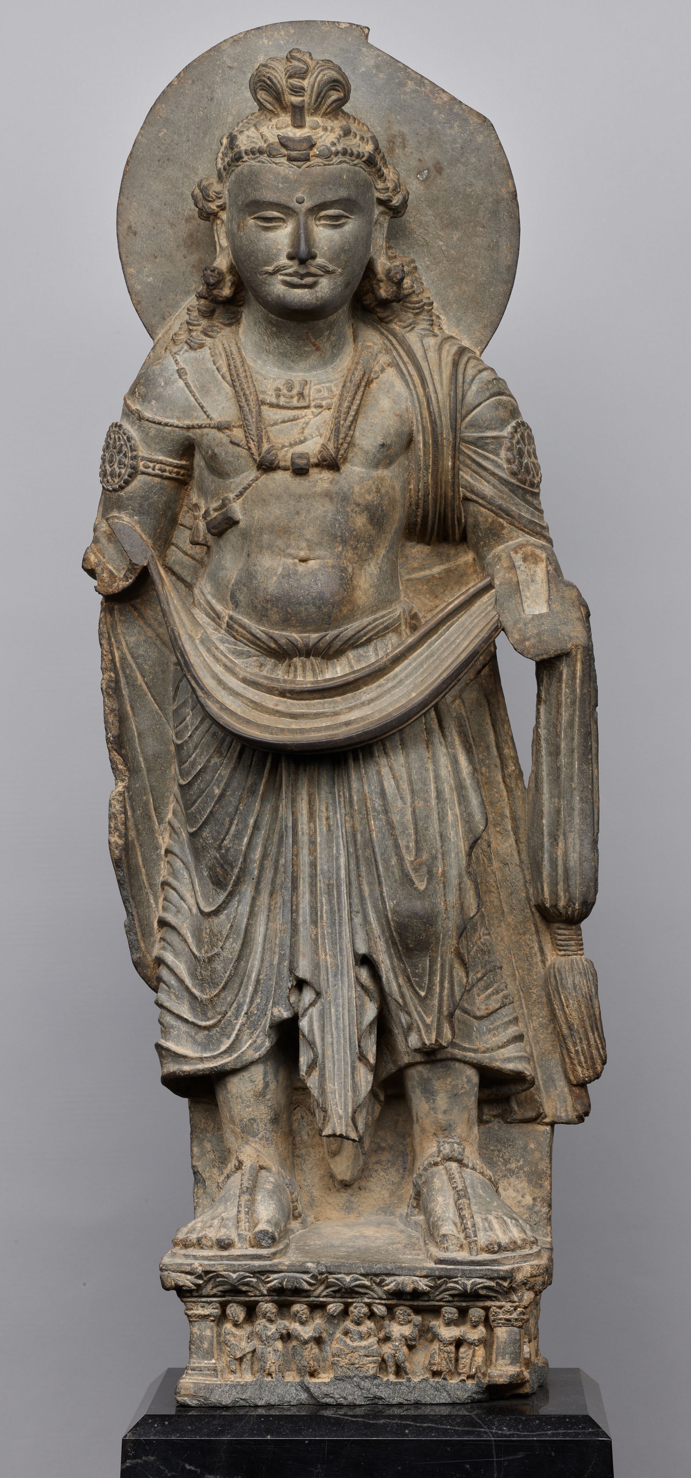 仏陀が出家する前は王子だったことから、この菩薩像には堂々と気品に満ちた王族のイメージが重ねられています。斜め掛けしているのは護符紐(ふごひも)です。飛び出すライオンをかたどった耳飾りやドレッドヘア風の垂髪など、まさにガンダーラのファッションです。