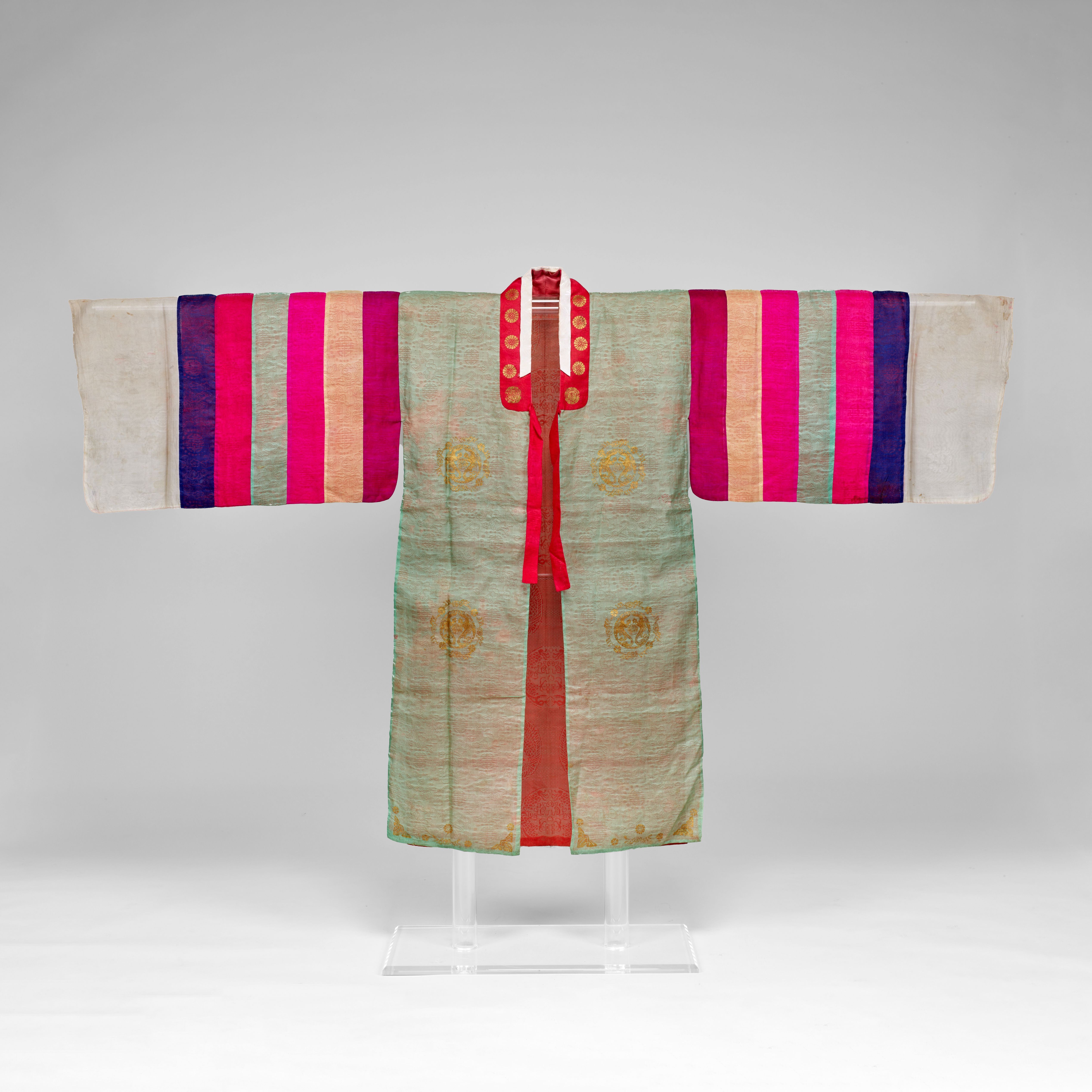 朝鮮時代の女性が婚礼の際に着用した上衣です。袖先の白い裂は汗衫(ハンサム)と呼ばれ、手先を隠すためにつけられています。袖の色縞(セクトン)と透けるように織り出された寿字円文(じゅじえんもん)、花唐草が華やかさをプラスしています。