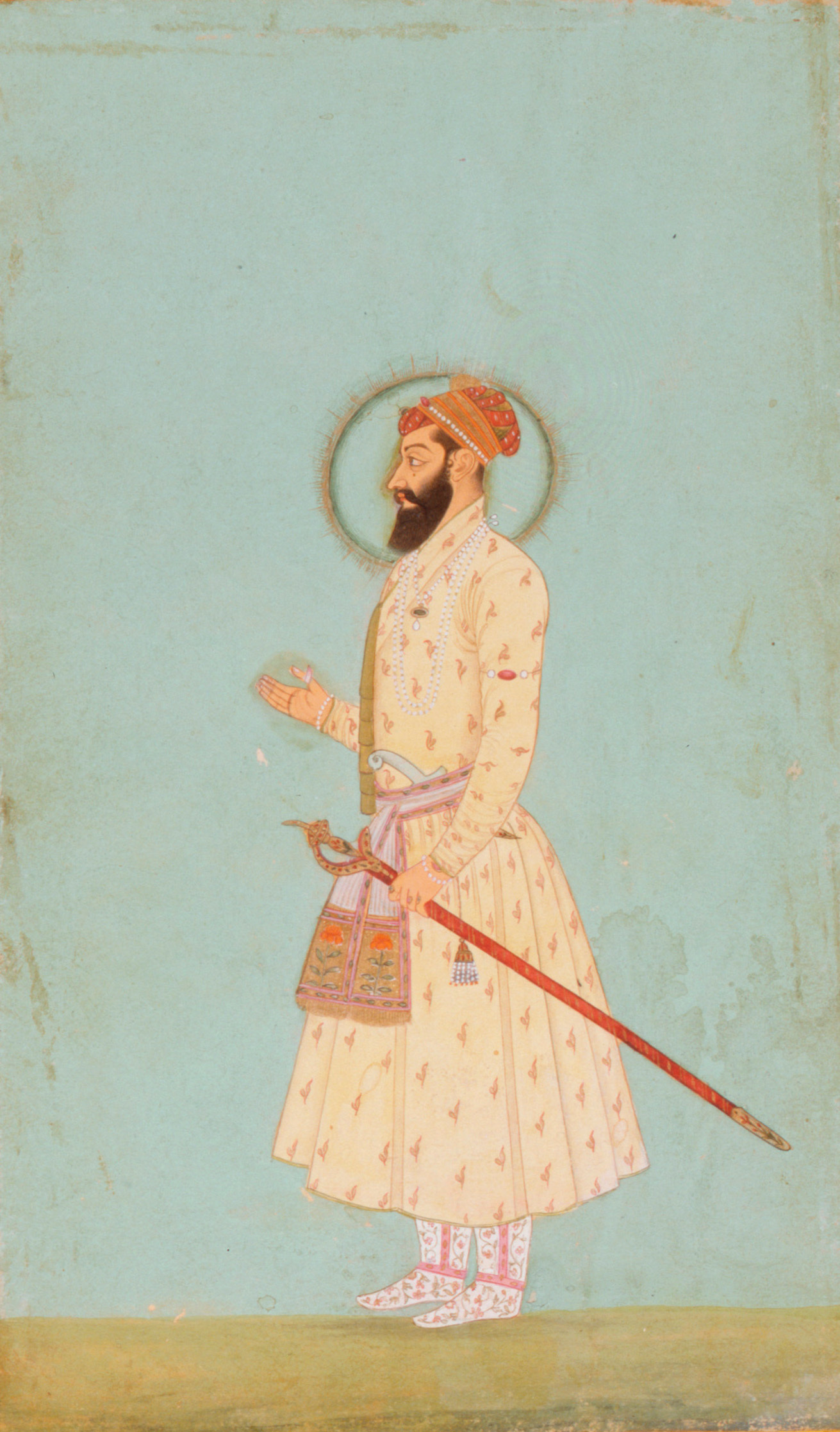 アウラングゼーブはムガル帝国第6代君主です。頭には宝石で飾ったターバンを巻き、胸元には大きなネックレス、腕にはブレスレットやアームレットを着けています。