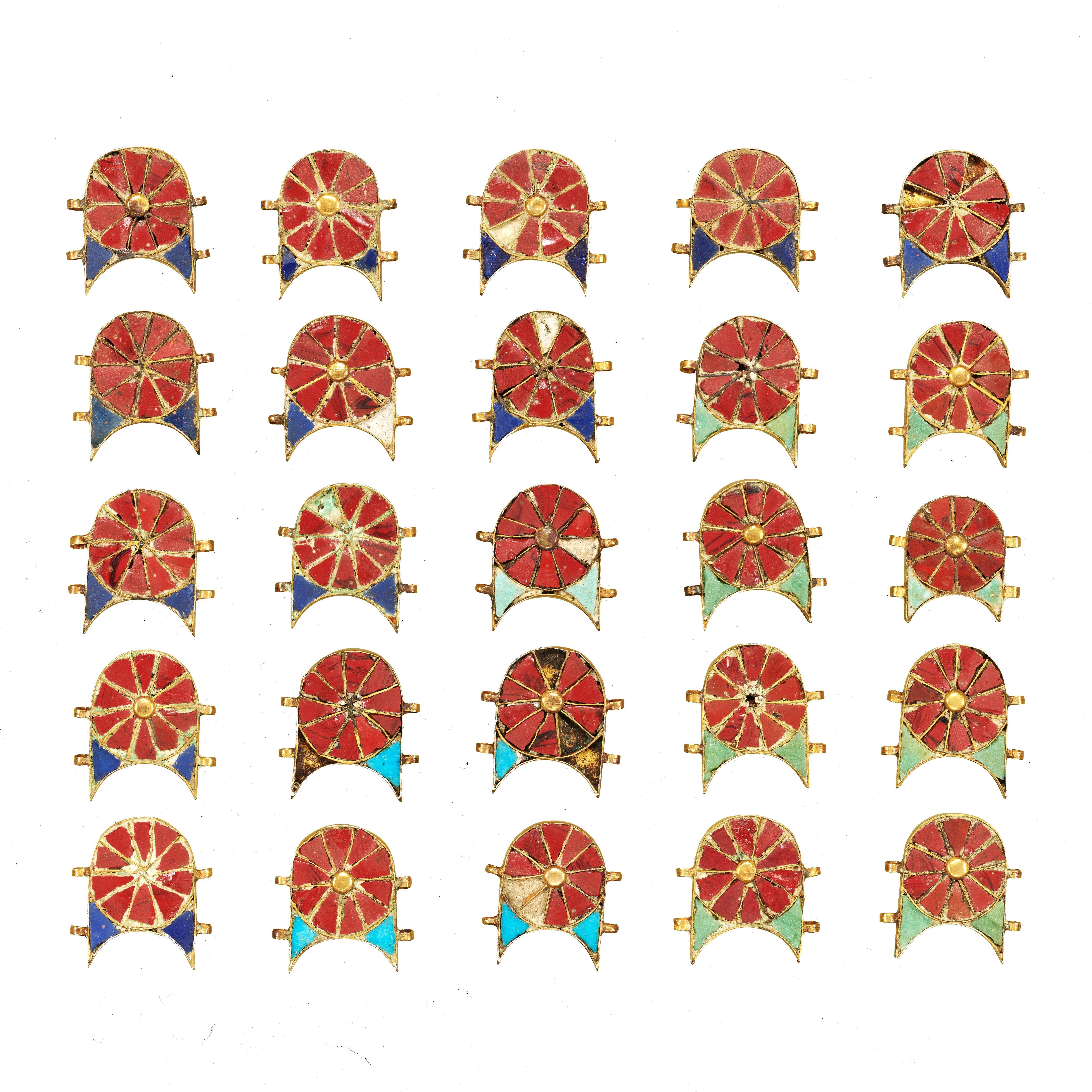 金製のロゼット文様の土台に色ガラスや宝石を嵌(は)めこんだジュエリーです。ひとつずつ綴(つづ)って細長い帯とし、それを髪の上から何本も垂らして身を飾りました。エジプト王、トトメス3世に嫁いだ西アジア出身の王妃たちが身に着けたと考えられます。