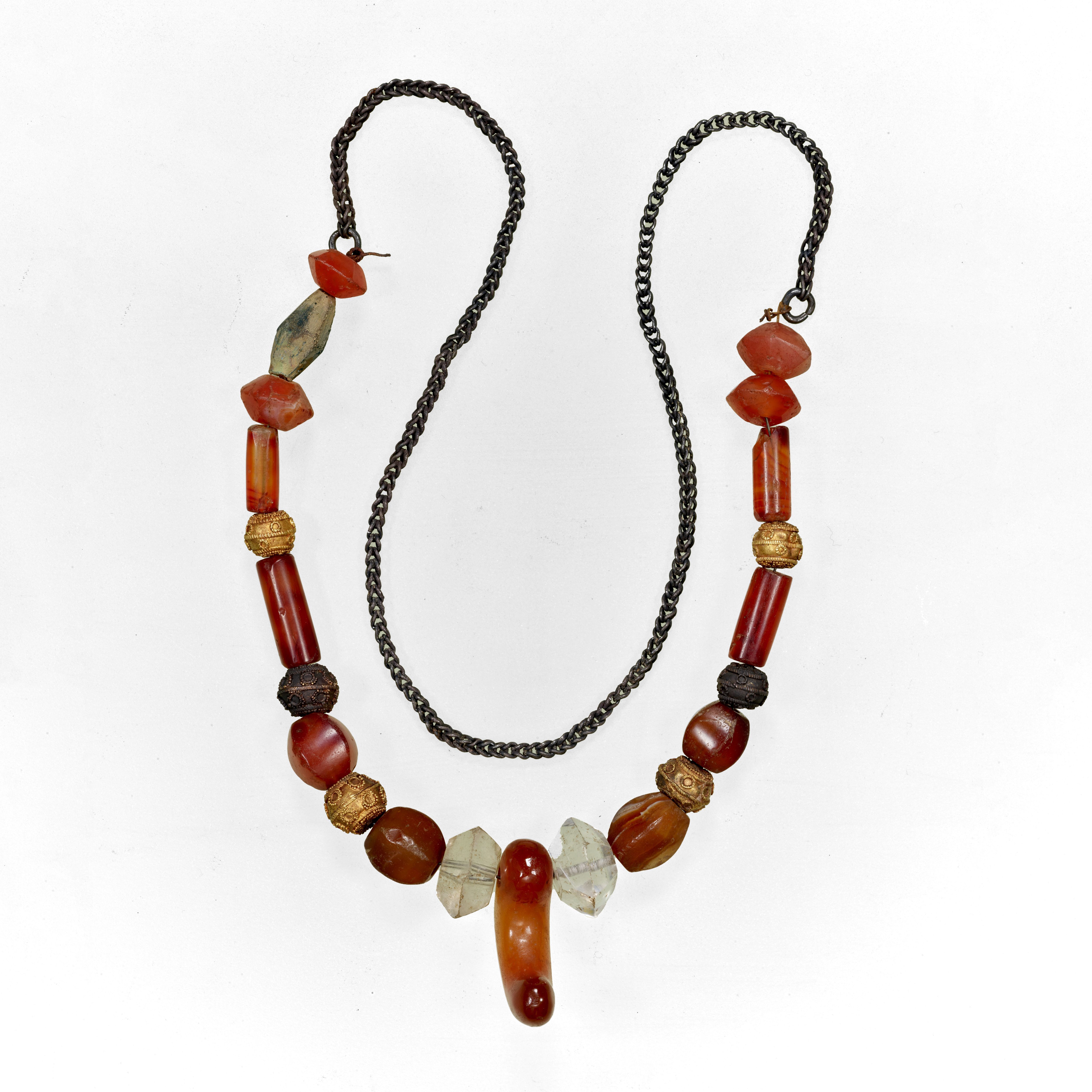 古墳に葬られた婦人が着用した頸飾です。瑪瑙(めのう)製の勾玉(まがたま)を中心に、水晶製切子玉(きりこだま)や金製の空玉(うつろだま)など、異なる素材と形で構成されています。色と形のコントラストが際立ちながらも一体感があり、当時の高い美的感覚が窺(うかが)えます。