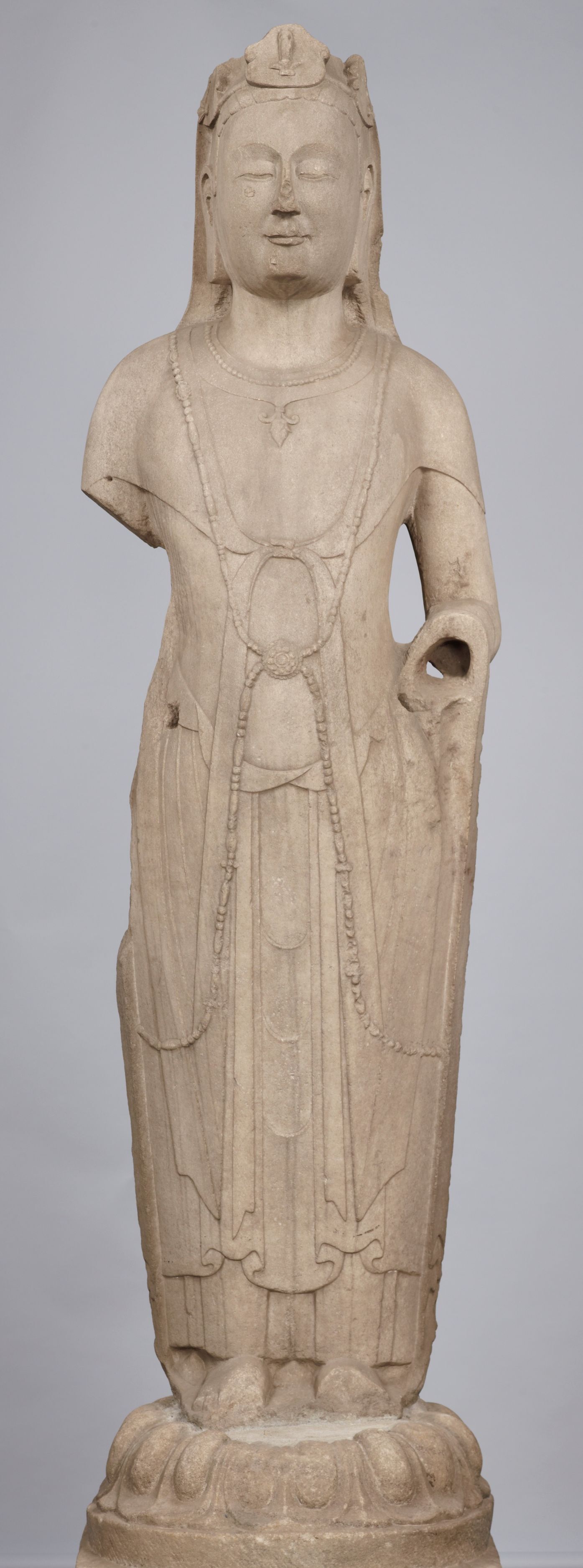 高さ2.5メートルを超える大理石製の大きな像です。二重に重ねた首飾りや、ペンダント状の飾りを中心にクロスするアクセサリーが、さわやかな雰囲気を作り上げています。前時代の流行をさらに洗練させた隋時代の新たなスタイルが、すらりとスマートな長身を際立たせます。