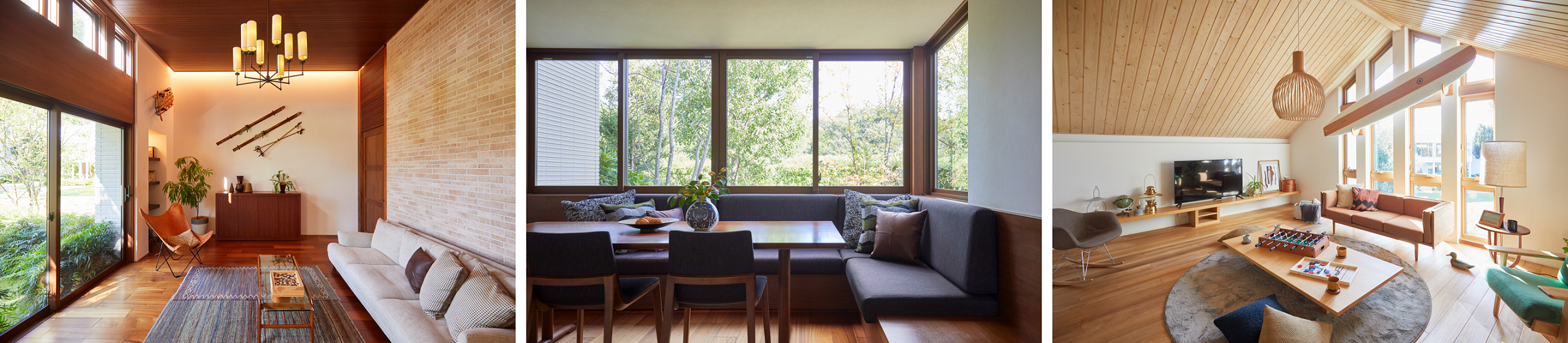 特長:四季折々に変化する自然の光や風、音を感じながら本当の豊かさを住まいに求める家族を想定したモデルハウス。1階のメインルームは部屋の用途ではなく居心地の違う様々な「居どころ」で構成された大空間です。