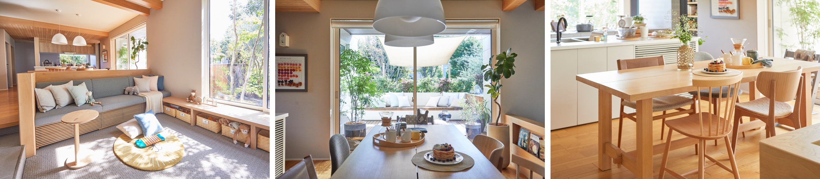 中央・右)自然な木色とホワイト色が優しい印象のダイニング