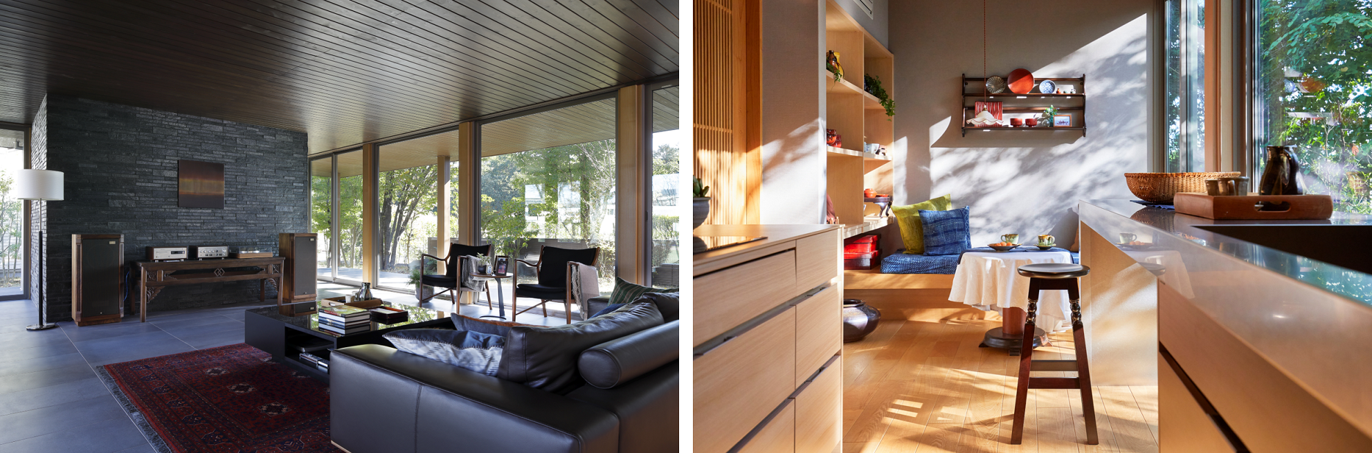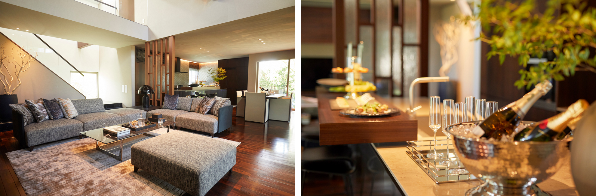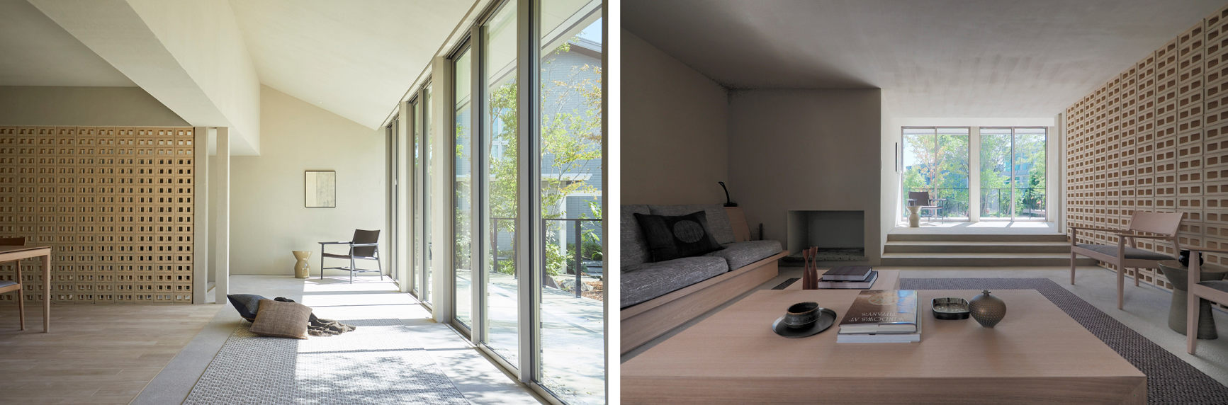 床・壁・天井の面が美しいシンプルな構成に、大判タイルや繊細な石貼り、木質天井など素材そのものを活かした空間(うつわ)。落ち着いたトーンのインテリアと開放的に繋がる外部が美しいコントラストを生んでいます。