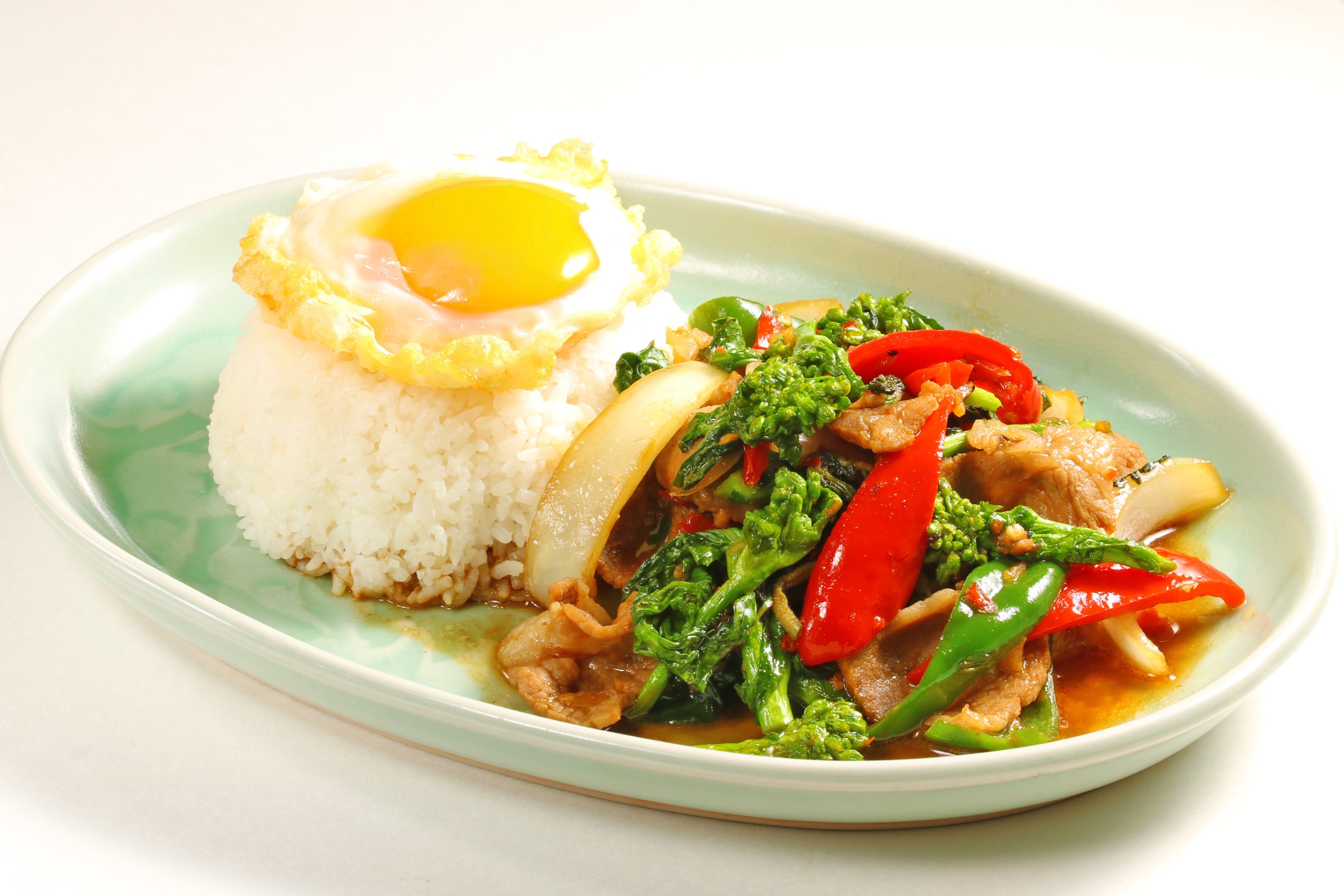 タイの屋台や食堂で人気No1メニューのガパオライス。当社では春の食材菜の花を使用して春の訪れを感じることの出来るメニューを開発しました。ビタミンたっぷりの菜の花と豚肉の相性が抜群!ホーリーバジルの香りも合わさり、さわやかな味わいとなっております。揚げた目玉焼きの黄身を混ぜながらお召し上がりいただきたい1品です。