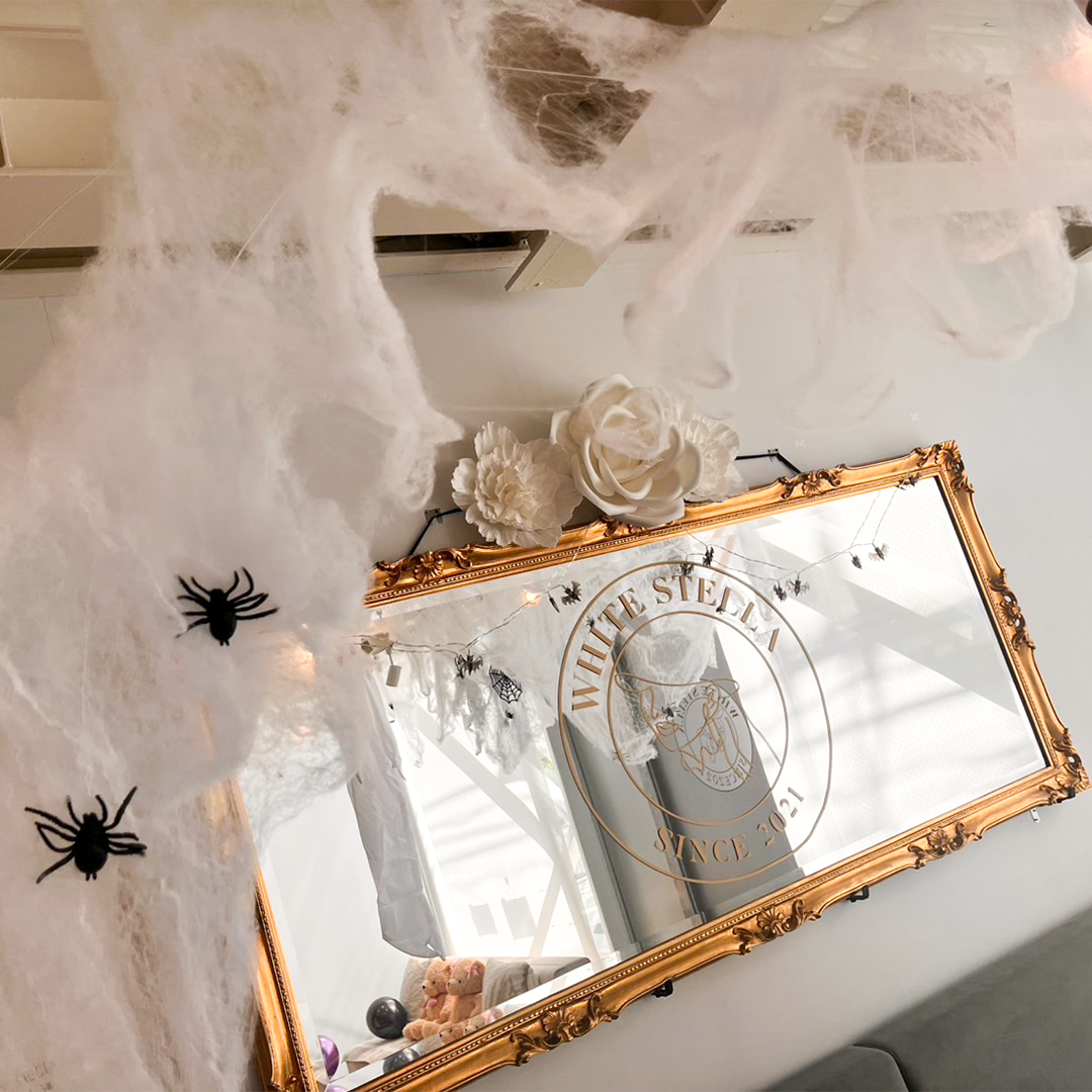 まるでお化けの国に迷い込んだかのような内装が広がる店内には、蜘蛛のオブジェやジャック・オー・ランタンなど、ハロウィンの要素を詰め込みました。