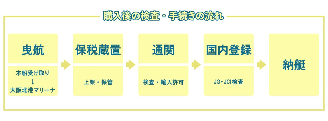ボート購入後は、「スムーズに乗れるようにしたい。」そんな要望にお応えするため、大阪北港マリーナでは50ftまでの輸入艇を輸入後の保税通関、その後のJG・JCI検査の 代行手続きを一貫して実施可能です。
