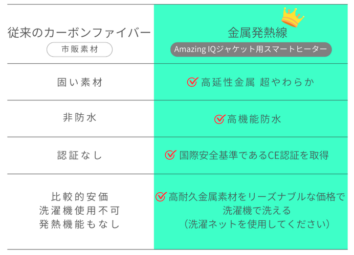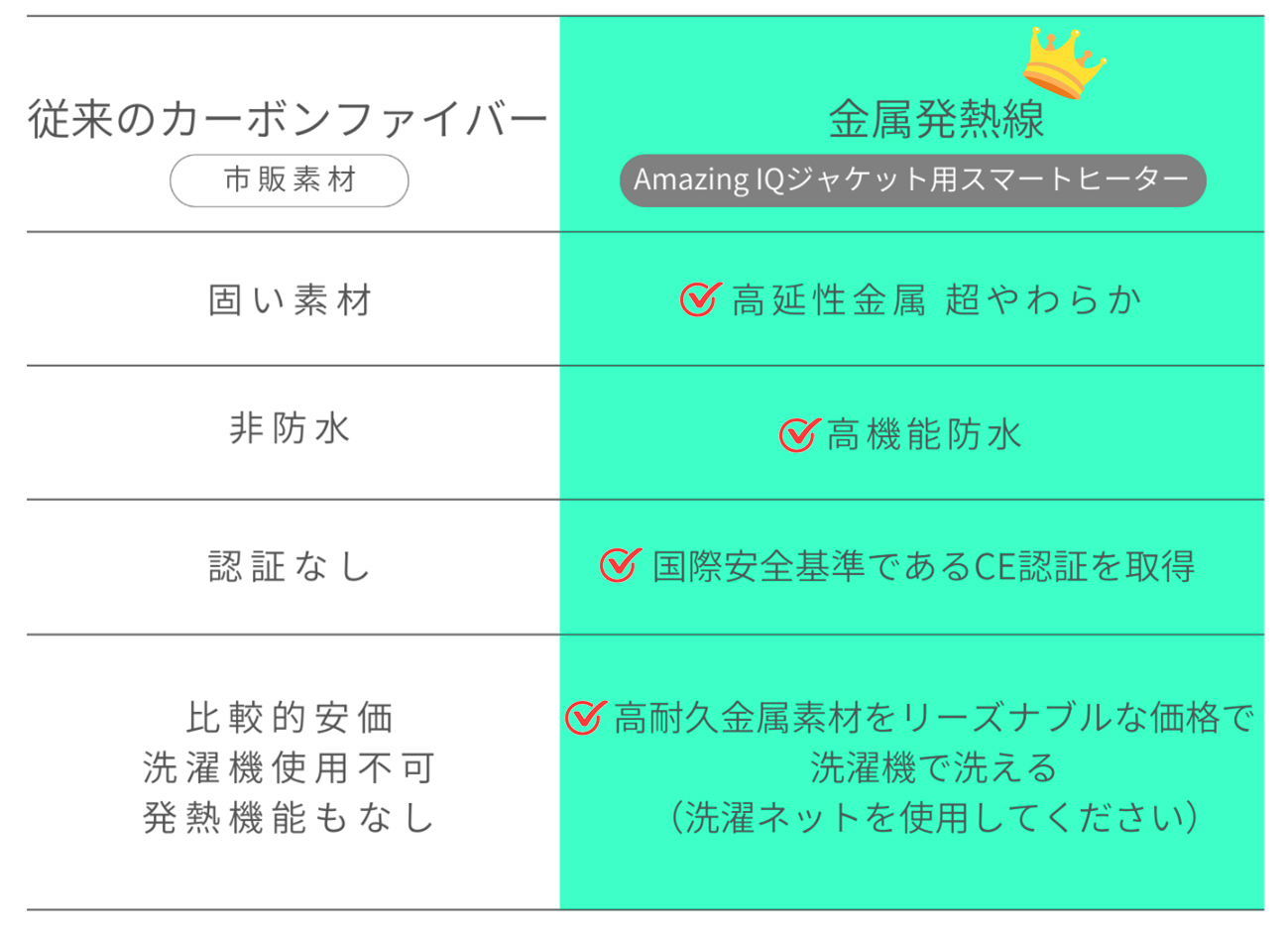 台湾で開発製造された「スマートヒーター」は極細・軽量の「金属発熱線」を使用しており、すべての繊維が耐水加工されています。そのため、洗濯乾燥OKでいつでも清潔!