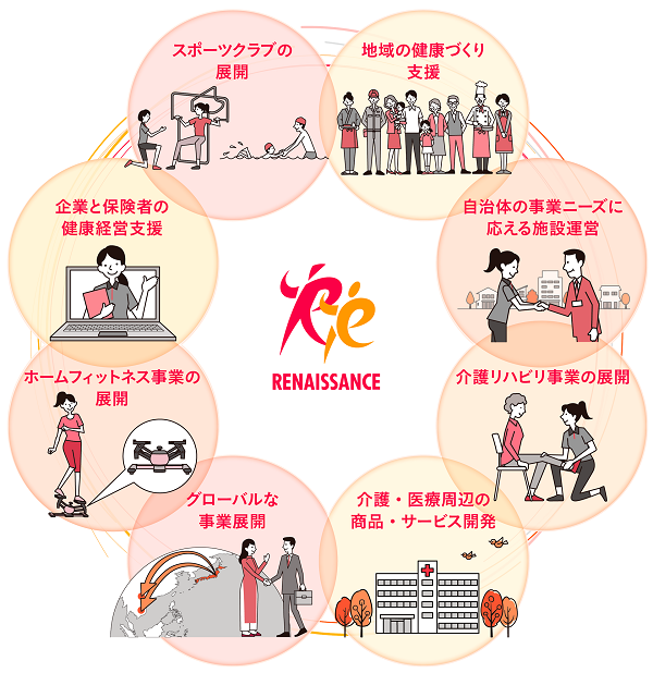 ルネサンスは、1979年の創業以来、「生きがい創造企業としてお客様に健康で快適なライフスタイルを提案する」という企業理念のもと、スポーツクラブ事業に加え、企業や健康保険組合の健康づくり支援や自治体の介護予防事業の受託、オンライン事業、海外市場へ向けた取組など、健康分野におけるサービスを多岐にわたって展開しております。