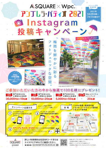 株式会社ワールドパーティー(本社所在地:大阪府大阪市、代表取締役CEO:中村 俊也)が展開するレイングッズブランド「Wpc.」は、滋賀県草津市のショッピングセンター「A・SQUARE(エイスクエア)」とコラボレーションを実施し、Wpc.のオーロラ傘などを使用した「A・SQUARE×Wpc. アンブレラ・パティオ2021」を開催しております。